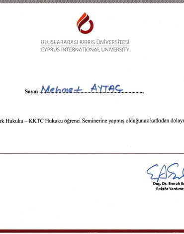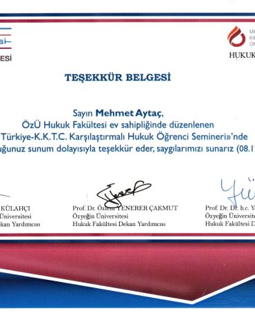 2017 yılında İstanbul Özyeğin Üniversitesi ile KKTC Uluslararası Kıbrıs Üniversitesi arasında düzenlenen 3. Türkiye-KKTC Karşılaştırmalı Hukuk Öğrenci Semineri’ne katılarak “Hukukta Silahların Eşitliği” konusunda sunum yaptı. Yapmış olduğu bu sunumda iki ülke hukuku arasındaki benzerlikler ve farklılıklara değindi.