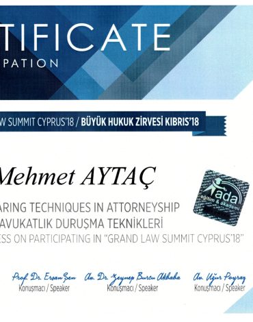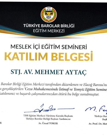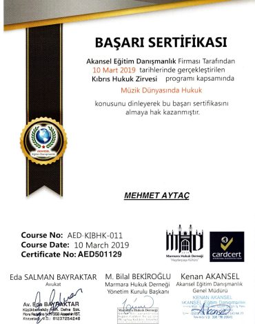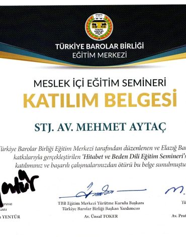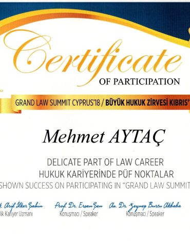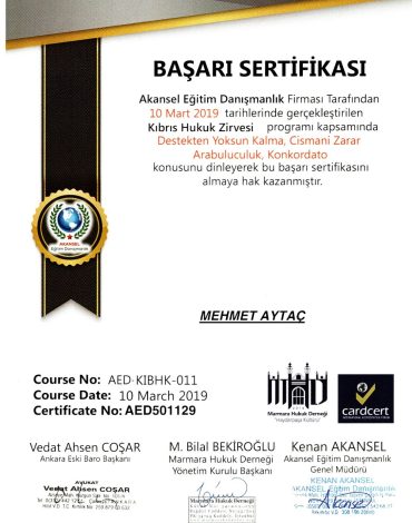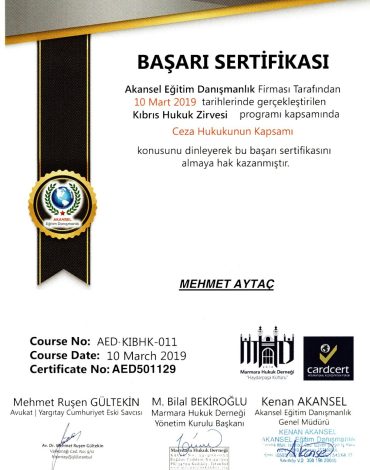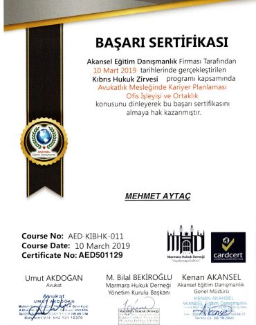 Bunun akabinde katıldığı birçok konferans ve eğitimler sonucunda başta Ceza Hukuku olmak üzere birçok hukuki konuda başarı ve katılım sertifikalarına sahiptir.