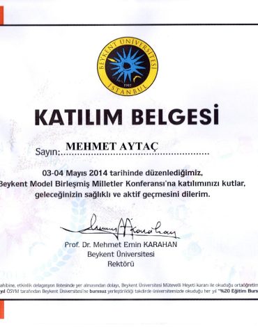 2014 yılında Beykent Üniversitesi tarafından düzenlenen, Beykent (MUN) Model Birleşmiş Milletler Konferansı’na katılarak Rusya Federasyonu temsilciliği ile katıldığı komitede iki Anayasa taslağında ana imza sahibi olarak adını yazdırmayı başardı. Lise yıllarındayken İstanbul’da IB(International Baccalaureate) eğitimi ile alakalı Beykent Koleji öğrencilerine IB eğitimine ilişkin soru-cevap şeklinde konuşma yapması için davet edildi ve Beykent Koleji öğrencilerine bu eğitim ile ilgili sunum yaptı.